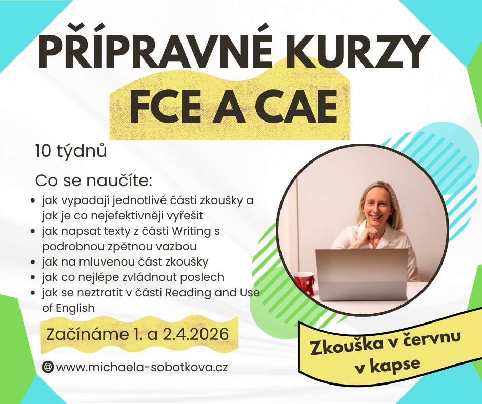 Ještě stále zbývá pár volných míst v přípravě na FCE/CAE, které začínají na začátku dubna. Oba kurzy cílí na červnové termíny zkoušky, tak pokud už jste přihlášení na zkoušku, neváhejte příliš dlouho. Přihlásit se můžete ZDE.
